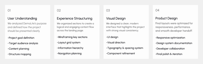 Our design process for DemoLite followed a structured Lean UX approach focused on clarity, simplicity, and effective presentation. Every step was aligned with showcasing the project professionally while ensuring smooth user flow and strong visual impact.