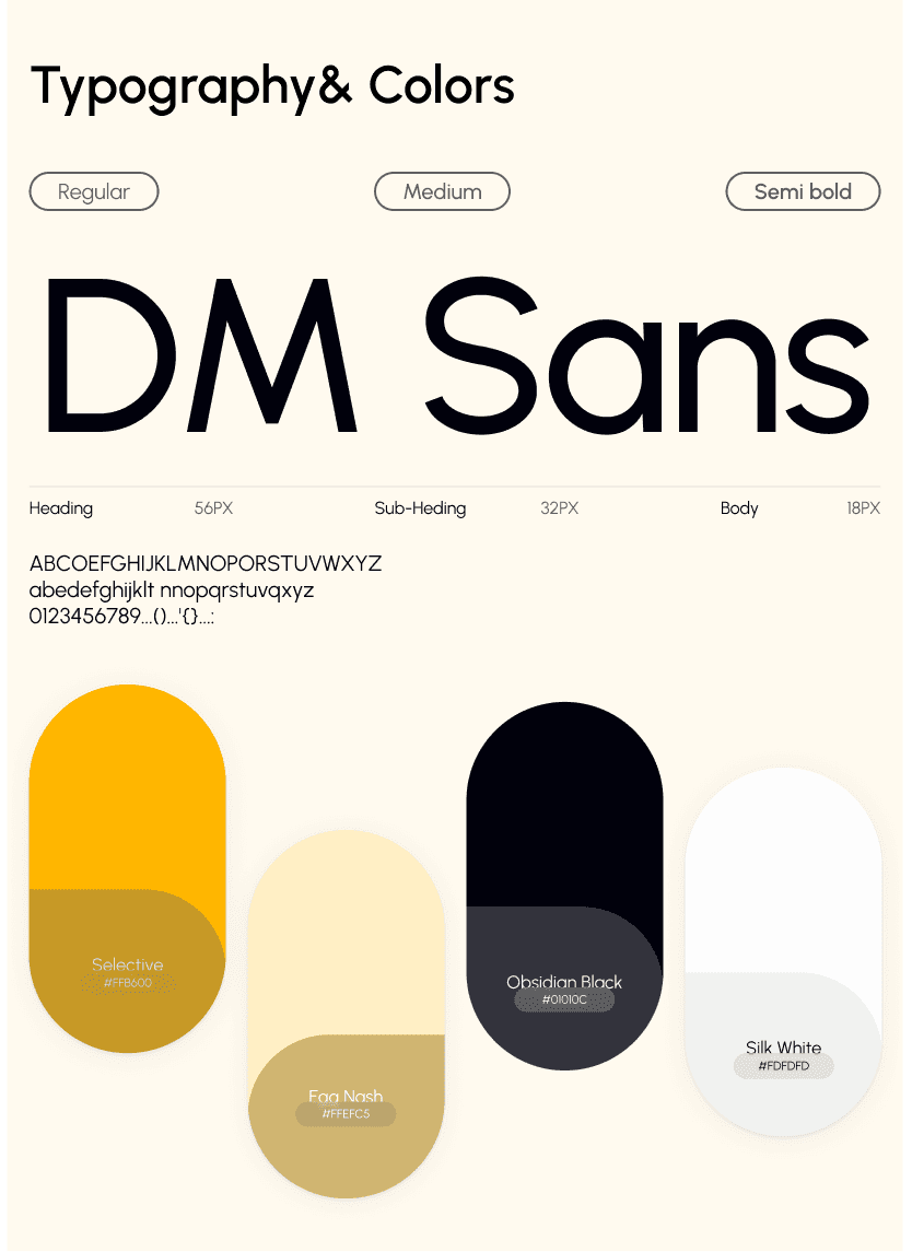 The DemoLite design system ensures clarity, consistency, and a strong visual identity. We used DM Sans as the primary typeface for a clean, modern, and highly readable interface. Bold headings create clear hierarchy, medium subheadings guide sections, and balanced body text improves readability across devices.