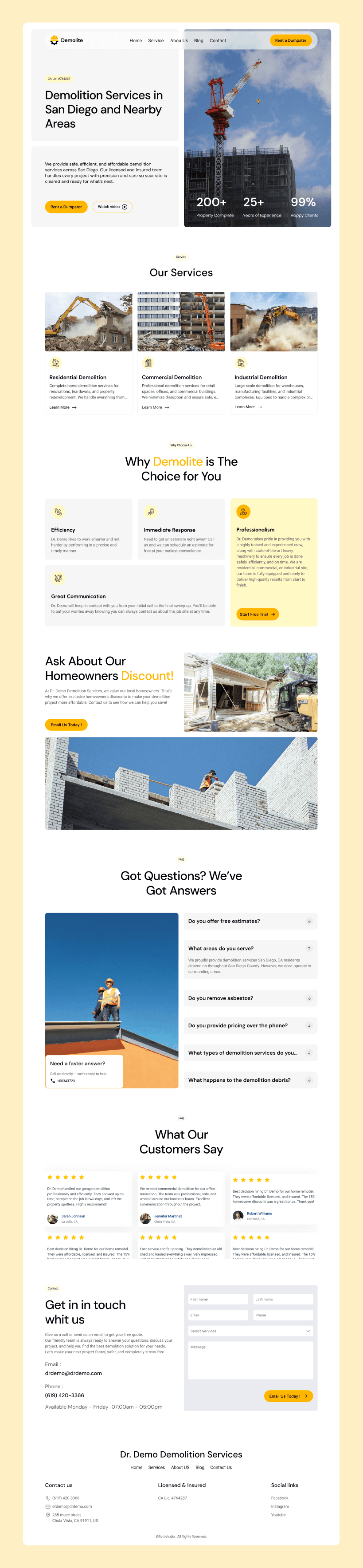 The DemoLite UI was designed to feel bold, structured, and professional—reflecting strength and reliability in the demolition industry. A clear visual hierarchy highlights key services, statistics, and call-to-action buttons, helping users quickly understand offerings and take action.