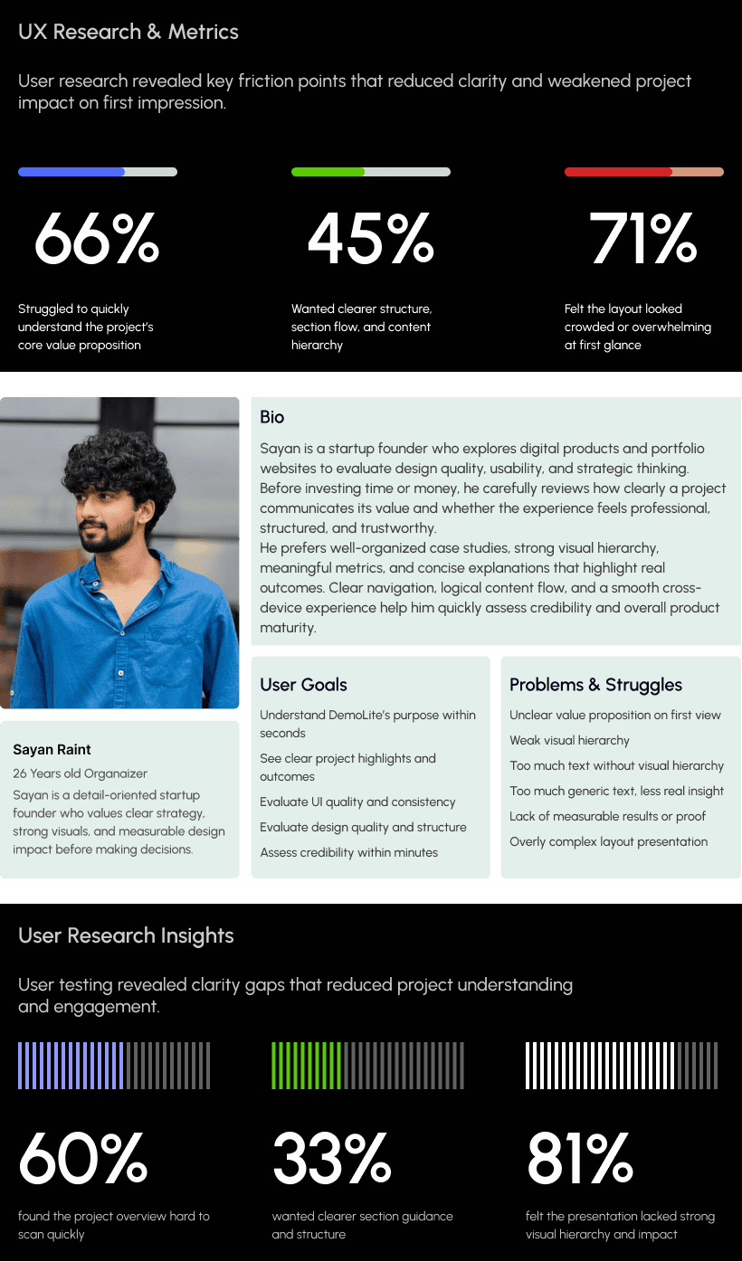 Understanding how users explore DemoLite projects was essential to shaping the platform. We analyzed how visitors browse portfolios, review case studies, scan visuals, and evaluate credibility before making contact or inquiries.